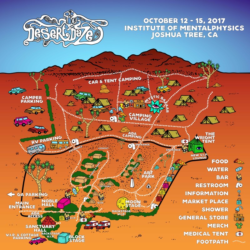 “The Desert Daze Marketplace will host hand picked independent merchants featuring unique arts, crafts, clothing, cuisine, and curiosities. Immersive art installations will return to the institute’s Sanctuary Hall and outdoor artpark, a well-curated selection of film screenings and speaking engagements will run all weekend in Noble Hall (NEW for 2017!), while guided meditations, classes and seminars designed to cleanse and strengthen body, spirit and mind return to the Mystic Bazaar. The exploration of sight and sound will again be set among the labyrinths, majestic garden walkways, visionary architecture of Frank Lloyd Wright and son Lloyd Wright and the grand otherworldly landscape of Joshua Tree, intentionally limited in capacity, to provide the best possible festival experience to all attendees.”
