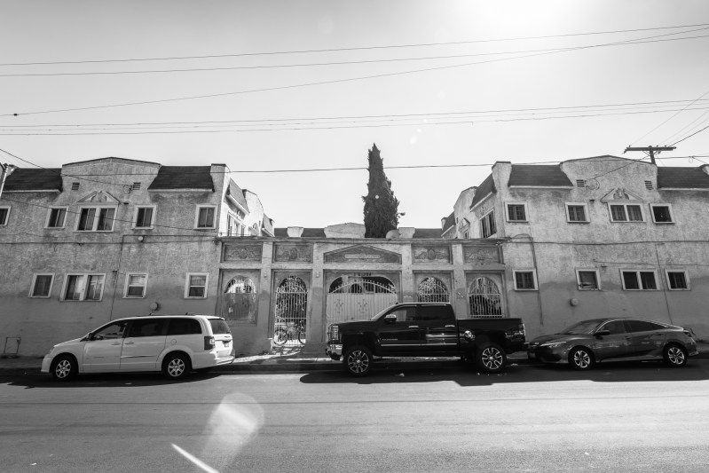 Eastside locations like Evergreen Cemetery and Our Lady of Guadalupe Sanctuary appear in the film, but arguably the best example of the parameters put in place for any American Me location is the Boyle Heights apartment building chosen as the Santana family residence. The two-level complex located on Mathews Street just south of 1st Street and one block east of Soto Street was constructed in 1925. Arching, stucco entranceways, and windows obstruct the modest courtyard; a decorative coat of arms adorns the top of the façade. Apartments facing the courtyard have steps leading up to their front doors, which, cinematically, create opportunities for dynamic staging and camera movement within a relatively small space.