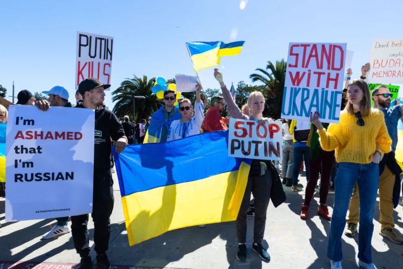 On Thursday afternoon, hundreds of members of L.A.’s Ukrainian community and activists rallied outside the United States federal building in Westwood, standing in support of their home nation of Ukraine following Russia’s invasion early Thursday morning.