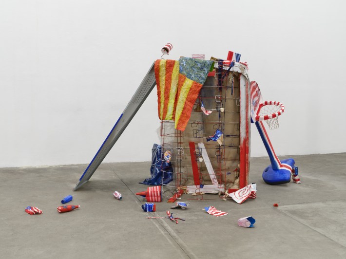 A gun props open a toilet seat, a boom box rests on a tire—walking into Acacia Marable's new exhibit “trash flag” at Human Resources in Chinatown, feels not unlike walking on some L.A. sidewalks.