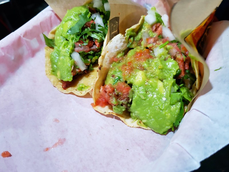 This lonchera is most known for their keto taco or what they call a “waffledilla,” but they have great al pastor. Their logo is a grinning donkey with a blinged-out gold tooth and plastered on the black truck is their mantra,“If you’re going to cheat, cheat with a taco.” The al pastor is so juicy that it glistens in the light almost like the meat is sweating. It tastes salty, sweet, and faintly spicy. The habanero salsa is a good pairing.