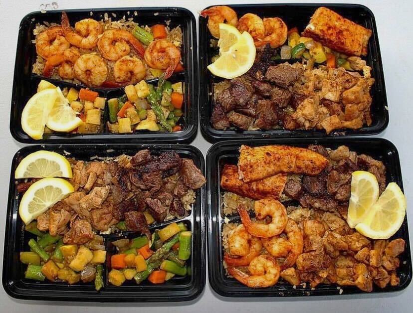BeHibachi has trucks that span from DTLA to Fresno. The menu combines seven proteins, such as lobster, scallops, and New York steak. White rice and vegetables are served on plates. Fried rice and condiments, such as garlic butter and a fiery diablo sauce, are offered.