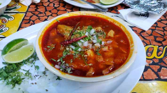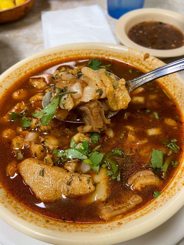 Cinco Puntos is the kind of landmark that you go to knowing and expecting the food to be good. They are a service to the community, offering various Mexican food ingredients and powerful Mexican dishes like beautifully cooked carnitas or for the purposes of this list, menudo. The menudo is classic, chock full of hominy for all of you who prefer more granos than tripe. There is a floating island of delicious fat on the top of the broth that will either enthrall or unnerve you—just accept the temporary thrill of your soup. It is starchier than other ones on the list. The hominy breaks down to create a velvety broth to form a corn chowder almost, except one with delicious pansa. It’s served with the usual additional toppings like onion and cilantro and their awesome fresh handmade tortillas that are the size of a 45-inch record. Of course, it goes without saying, get some carnitas dude. - Cesar