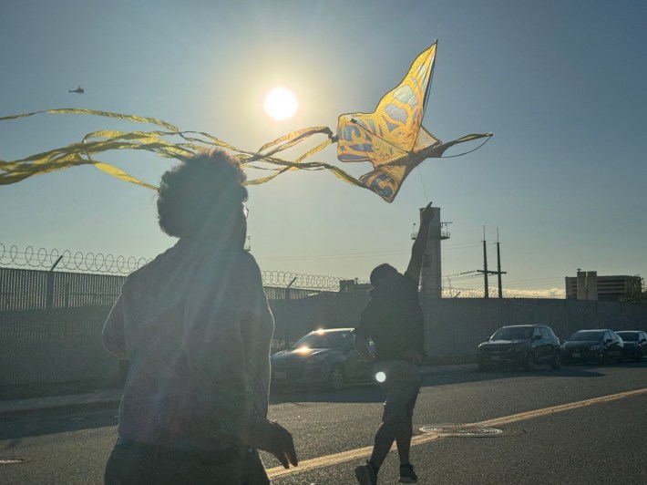 Attendees of the vigil fly kites, blow bubbles, and draw on the sidewalk with chalk. Dogs and children mingle.