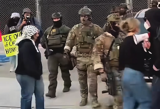 - Video footage of a protester shoved to the ground by a federal immigration agent