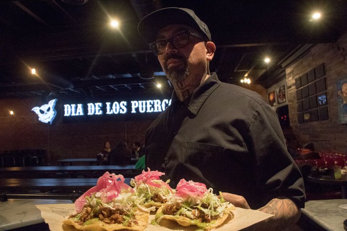 The one item on the menu that really makes grandma proud is the Taquitos de Weenie. Garcia grew up eating tacos made with wieners as the protein – a quick, inexpensive meal. The taquitos at Dia De Los Puercos are rolled in handmade tortillas, fried, and topped with ketchup, mayonnaise, mustard, cotija, and grilled onions. “So it's kind of got that street dog flavor, but you have a tortilla instead of a hot dog bun,” Garcia explained.