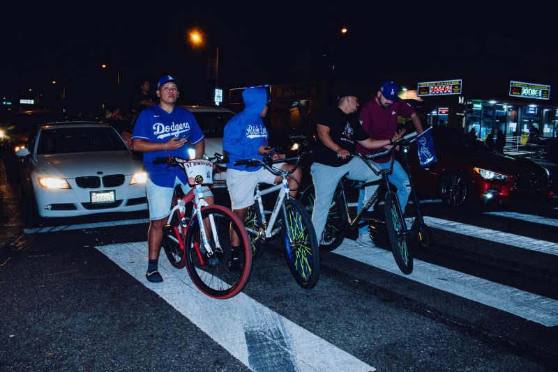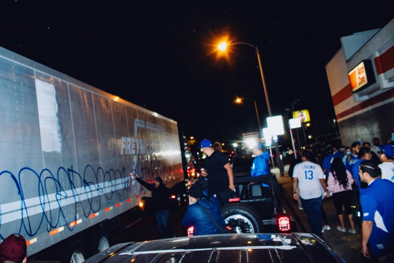 [dropcap size=big]A[/dropcap]s they do every time there is a major win for the Lakers, Dodgers, or Mexico in the World Cup, committed sports fans around East Los Angeles communities gathered in East L.A. to celebrate their team. With Whittier Boulevard blocked off to vehicles from Eastern Avenue to Gerhart Street in the City of Commerce, East L.A.'s main drag became an impromptu boardwalk full of ecstatic Dodger fans.