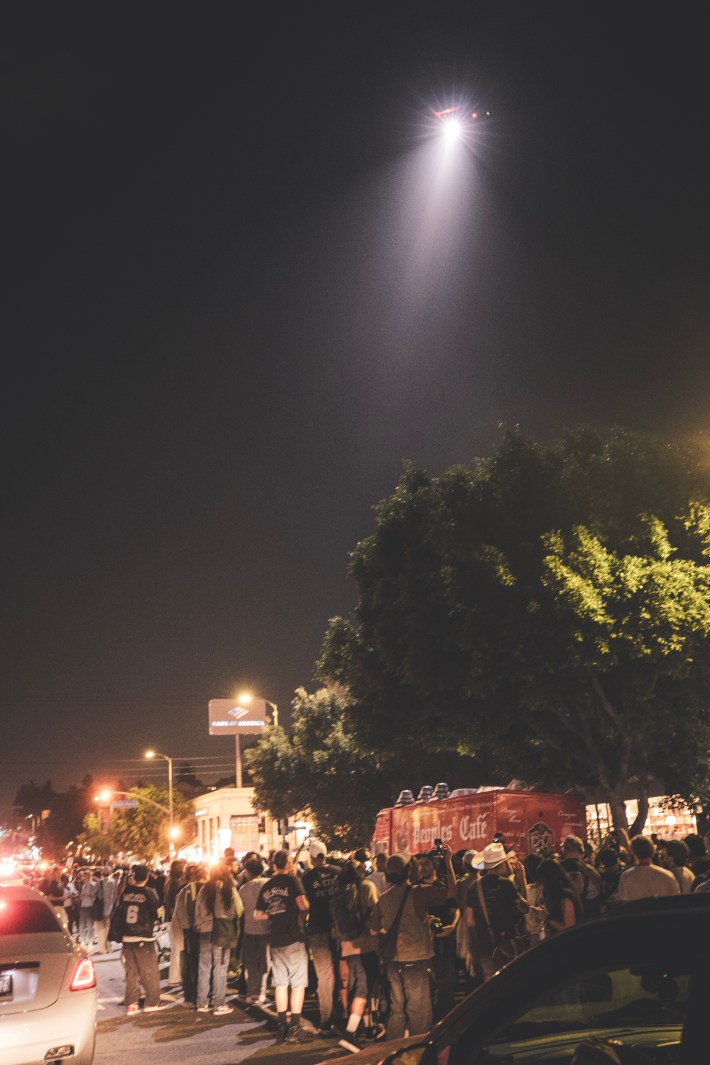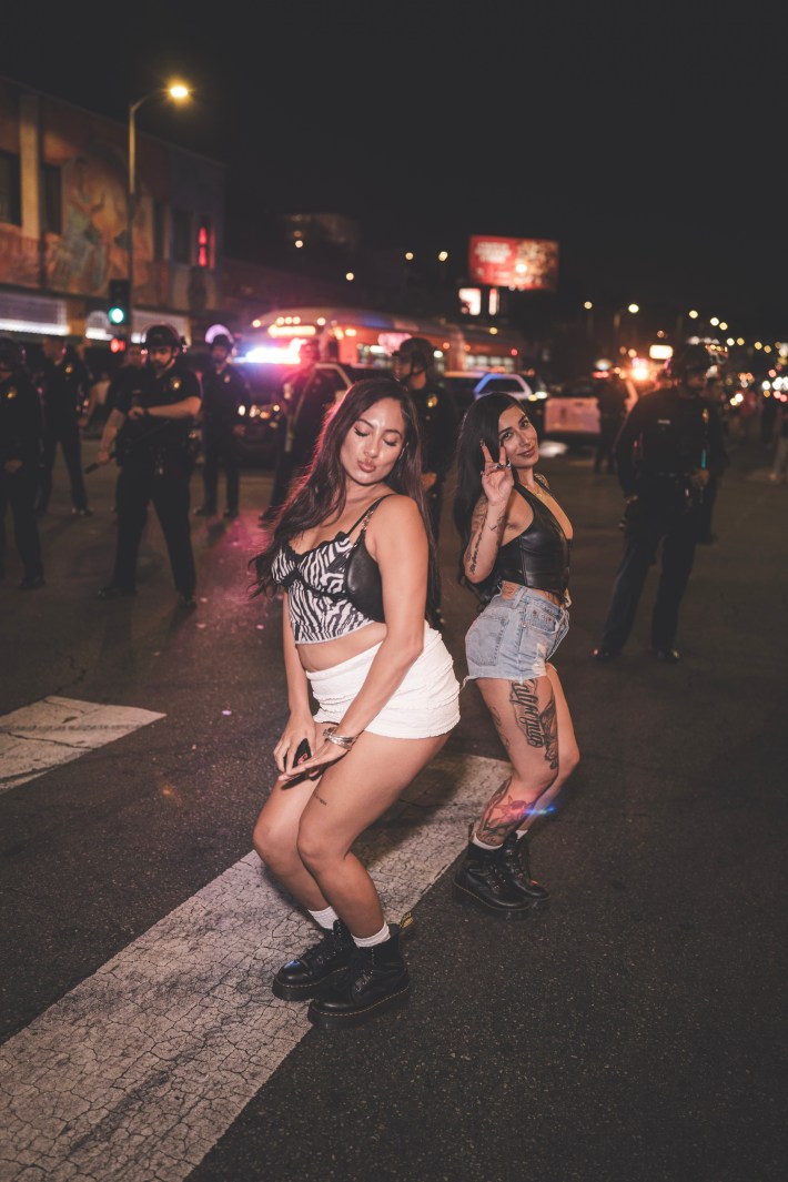 The night scaled from a busy sidewalk hang before opening, to pop’n and ’lock’n crowds flooding Sunset Boulevard by 9:30. By 10 PM, ghetto birds (helicopters) started to circle and flash the party. LAPD ended the night over an hour later after pushing a police line from Echo Park Avenue to Logan Street.