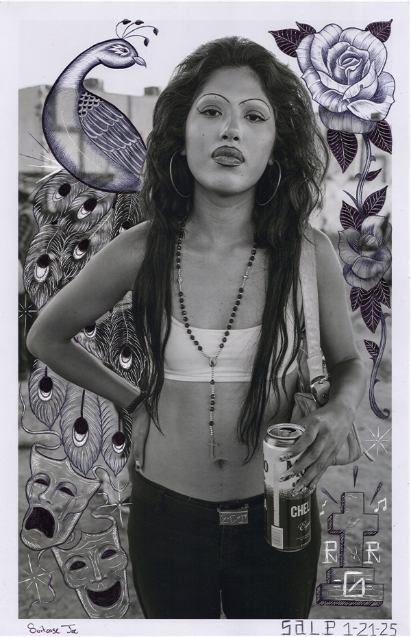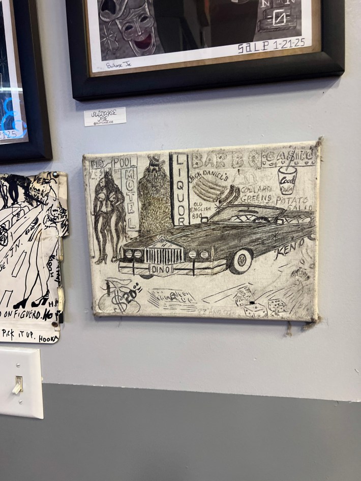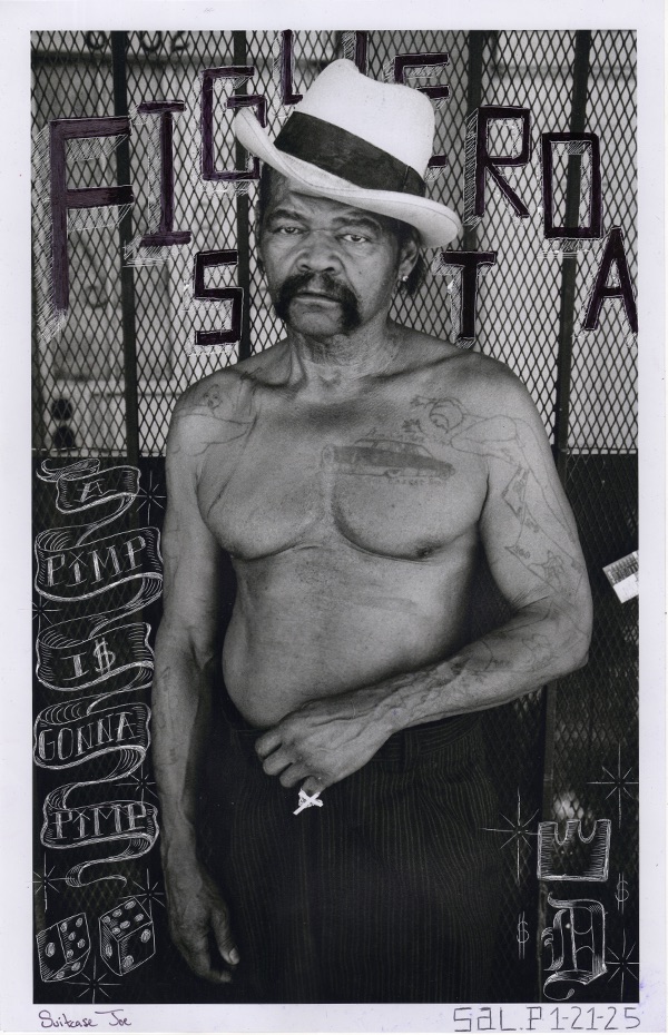 The prior Wednesday, I dropped off art for the show from “Illustrated Madness,” a booklet I put together featuring original drawings over Suitcase Joe’s photos. First showcased earlier this year at Beyond The Streets, one of Sal’s contributions to the project featured a scratched-in memo and a pair of dice on a portrait of King Dino, a homeless artist known for portraying and dressing as a pimp.