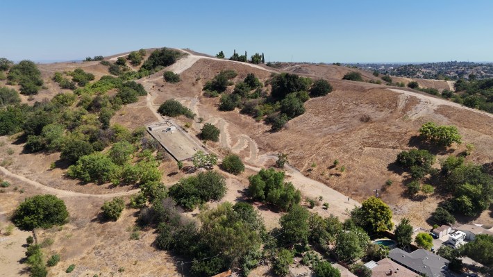 Nearly 16 years later, Elephant Hill’s first-ever walking trail is finally being constructed by the Los Angeles Conservation Corps and Bellfree Contractors. Coast live oak and black walnut trees will be planted and boulders and fire gates will prevent off-roading. But the trail is overshadowed by Hoo’s development, which has grown into a 35 x 20 x 6-foot concrete eyesore surrounded by a chain link fence, exceeding the permitted 2-foot tall retaining wall and cement pads.