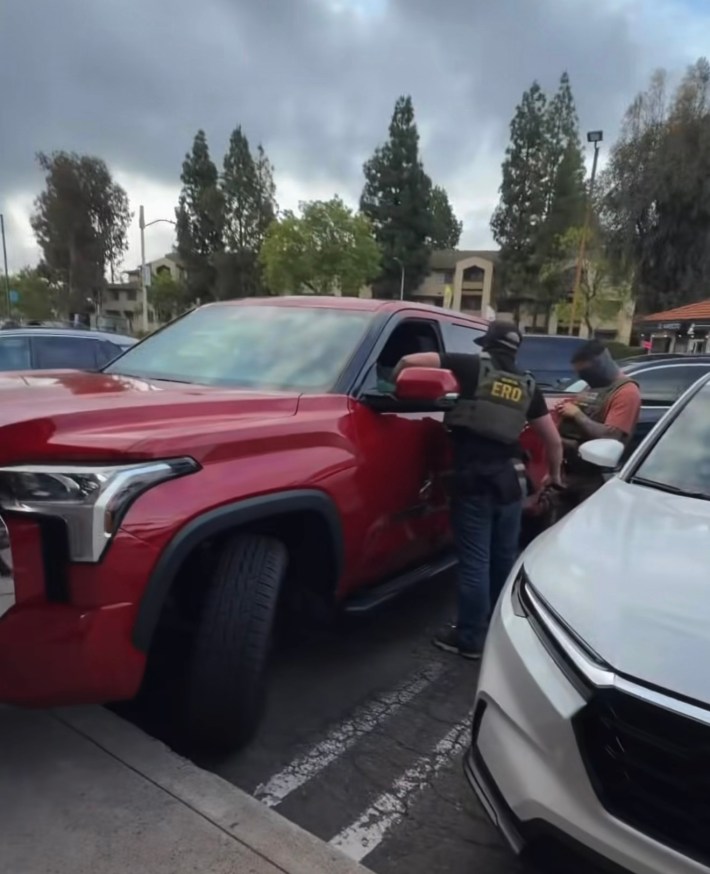 Video footage shared with and reviewed by L.A. TACO, shows at least four masked ICE ERO agents detaining three individuals and breaking the window of the driver's side.