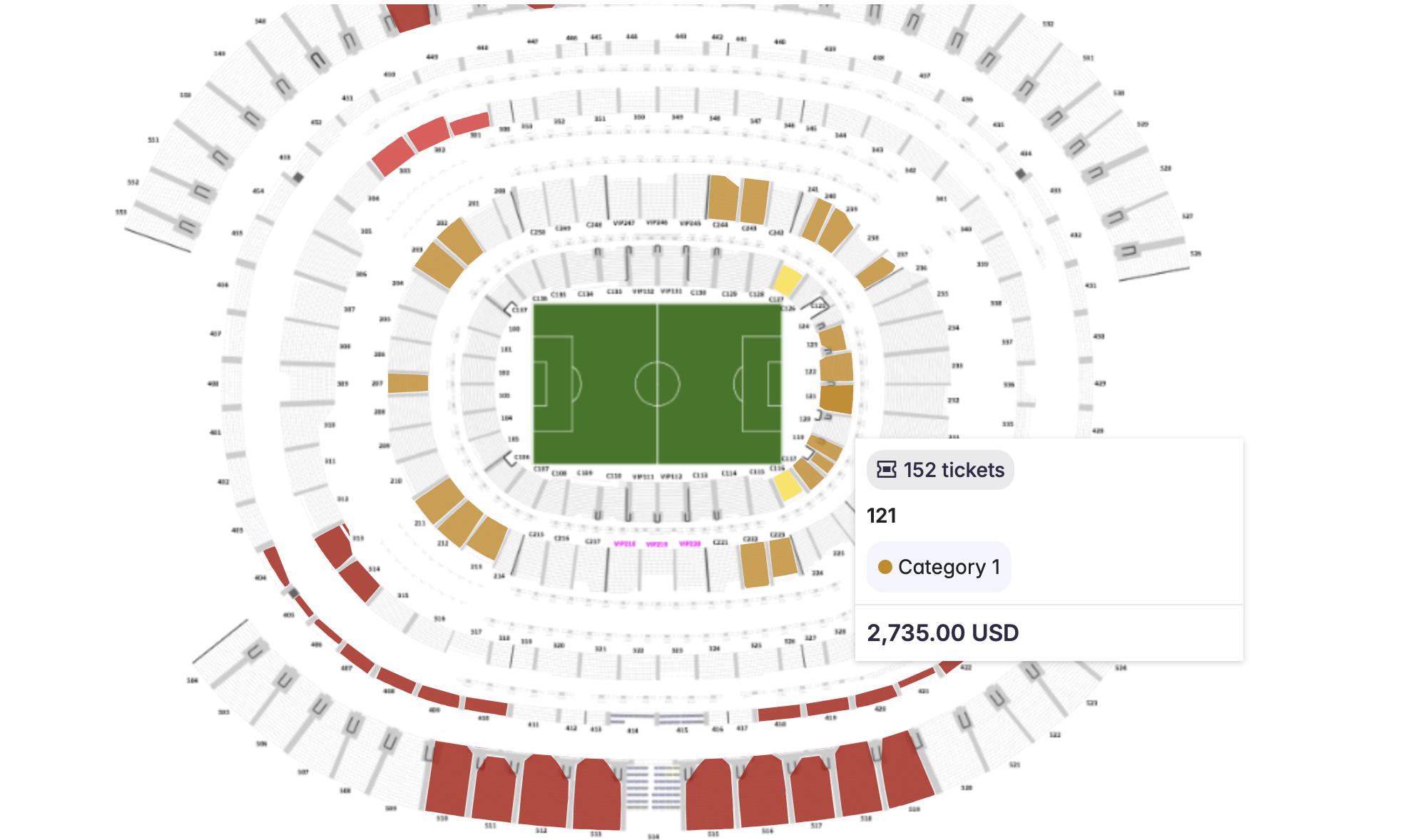I snuck a peek at the opening game and the quarterfinal game. A ticket behind the goal of the opening match was on sale for $2,735.00. A ticket behind the goal on the opposite end of the stadium for the quarterfinal match cost $5,730.00.