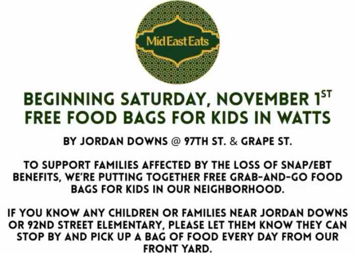 Mid East Eats in Watts will be giving away free grab-n-go food bags for kids, every day starting this Saturday, November 1, near Jordan Downs and 92 Street Elementary. All are welcome to a bag, which can be grabbed in the business' front yard, though they specifically intend them for hungry kids walking home from school whose parents may be at work.