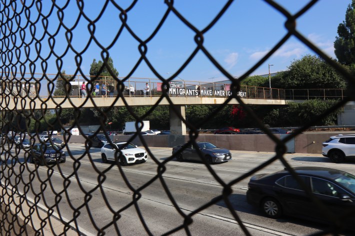 It’s not a bird, nor a plane, that’s making commuters in the San Fernando Valley look up and honk their horns. It’s a group of residents who are trying to shake things up with their signs of solidarity suspended over one overpass of the 101 freeway.