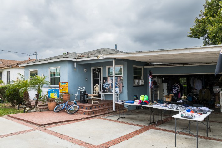 But just before 11 o’clock, one house comes to life. The garage door of 1418 W 126th Street opens, and a woman places two chairs—one white folding and one that you might find at a dining room table—on the brick porch. A worn egg crate is set on its side, and a boom box is placed on top of it. A blue Cranbrook cruiser bike is laid on the steps leading up to the porch.