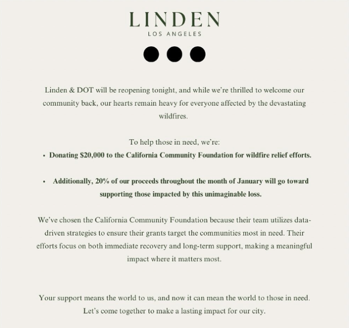 This week, we want to highlight fundraisers organized by a handful of L.A. restaurants and food makers in the coming days. The L.A. food community has come out hard to feed first responders and those affected by the fires and evacuations, with many offerings, such as free meals and fundraisers, over the past few days.