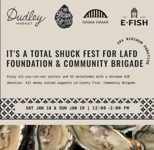 Dudley Market is holding a "Shuck Fest" on Saturday and Sunday, featuring all you can eat oysters for $20 and $5 micheladas, in collaboration with Hama Hama, E-Fish, and The California Seafood. 100% of the proceeds will go to Community Brigade and L.a. Fire Department Foundation.