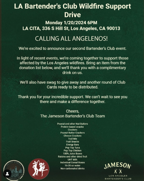 The good folks at La Cita are holding the L.A. Bartender's Club Wildfire Support Drive on Monday, Jan. 20. It asks that you bring one of the listed food donation items and you'll receive a drink in return.