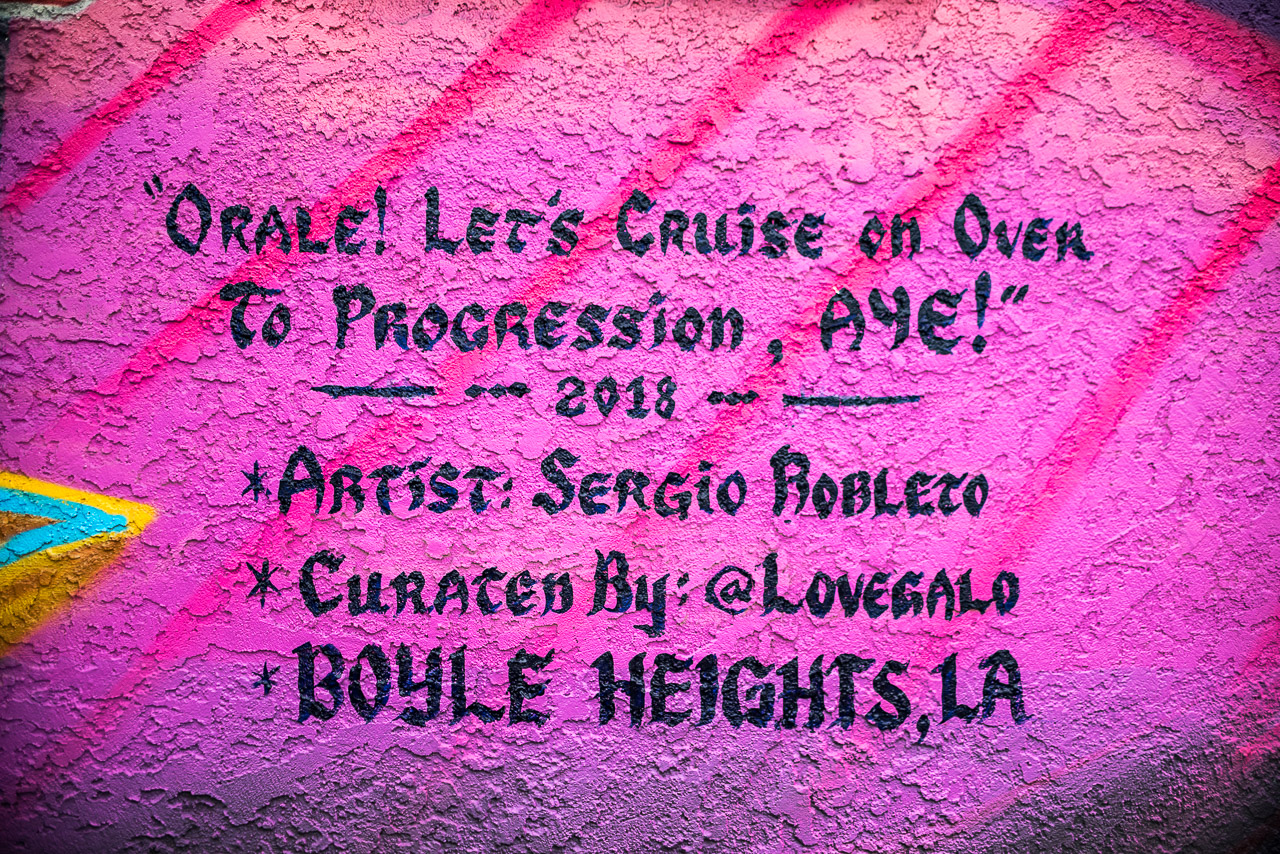 More than 30 years later, Galo and Sergio paid tribute to that mural. Both Botello and Healy are featured in the same car they painted at the Shell station. Botello is in the front seat throwing the peace sign. Healy is in the back seat throwing the Chicano fist. The car is heading west as that is where the gentrification is or appears to be happening most in Boyle Heights. The title of the mural is Orale! Let's Cruise on Over to Progression, Aye!