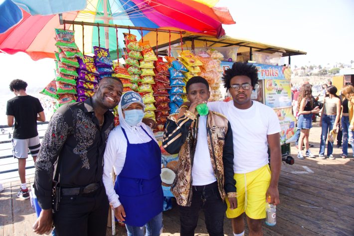 Dressed in all black, holding the speaker up in the air is Tiant Lewis, better known online as Chocolate Uno. Dancing down the pier next to him are his friends Ray Dobson and Andre Arnold. If you haven’t guessed by now, they are the trio named High Off Energy, whose videos dancing to Spanish music have gone viral on TikTok.