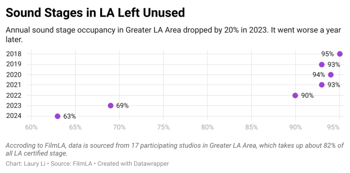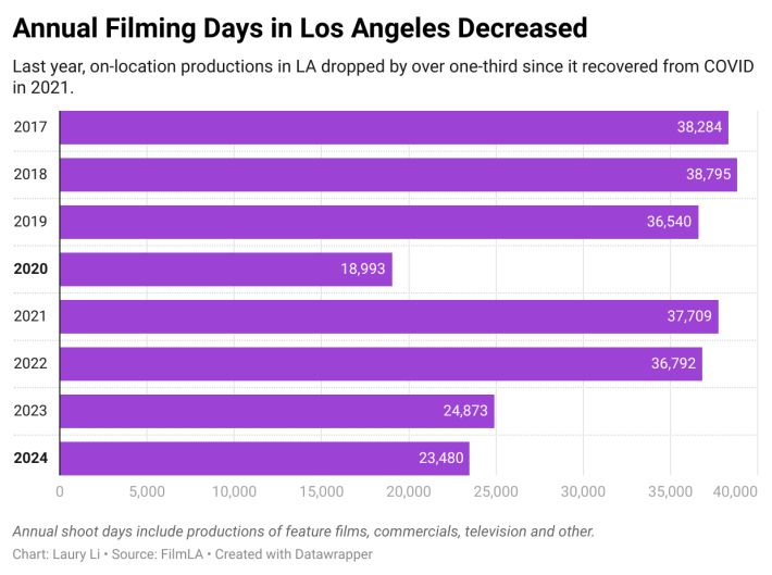 Los Angeles film shoot days have decreased by 35 percent annually since 2019, according to a 2024 FilmLA report. Specifically, television's annual shoot days are down by nearly 50 percent.