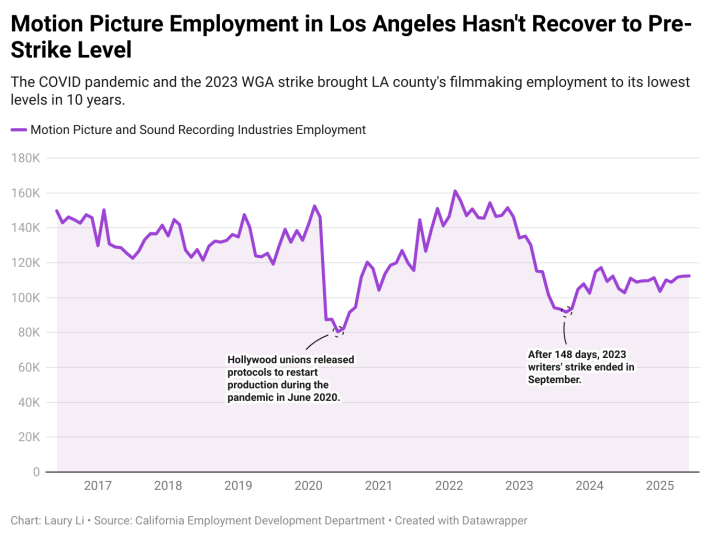 According to a 2023 study done by Otis College, Entertainment employment dropped 17% following the 2023 Writers and Actors strikes, as many executives began to cut production costs by minimizing writers’ rooms, laying off workers, and using below-the-line crew members to fulfill missing roles on set.