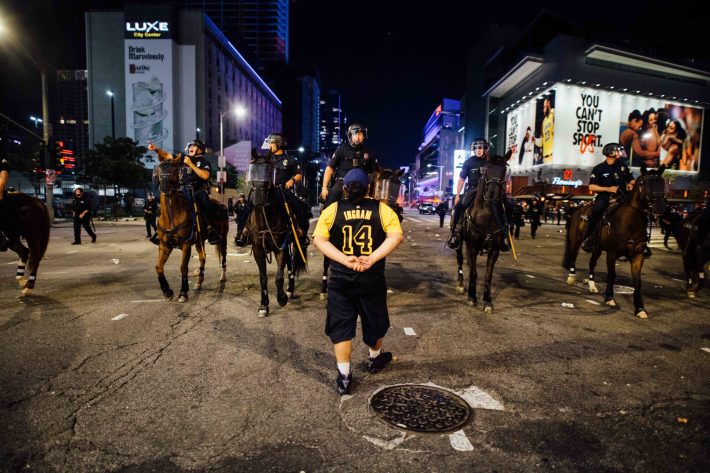 Chants of Kobe! Kobe! echoed through the streets of downtown L.A. as fans packed the streets, setting off fireworks, drinking beer, burning out with their cars, and climbing up light poles. Los Angeles Times is reporting that at least 76 people were arrested. The celebrations turned violent as videos on social media showed LAPD dispersing the crowds using non-lethal force by the end of the night.