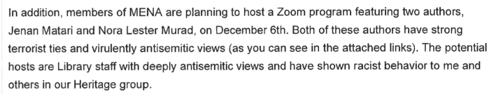 Skinner declined to comment on any contracts with Matari or Murad or about the staff librarian’s email accusing the authors and the staff organizing their event of antisemitism.