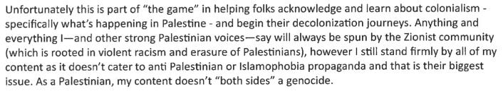 In her email response, Matari added that if people understand the context around Palestine as a “settler colony,” then Oct. 7, “becomes a clear example of oppressed peoples carrying out their international human right to resist an oppressor/occupier by any means necessary,” rather than Western media’s portrayal of it as an “unprovoked attack.”