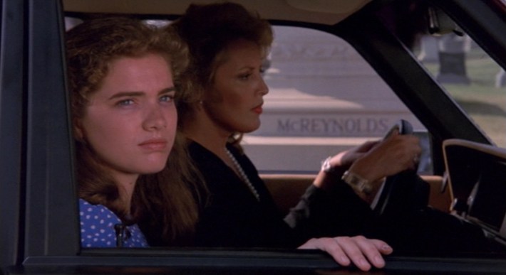 Langenkamp later mentions the stone chapel that is featured in one of the most minimalist, but thoughtfully composed shots in the film. After Rod’s funeral service concludes, Nancy sits alone on the steps of a gothic craftsman style chapel that was built in the 1890s. Set against the chapel’s oppressive gray stonework, Nancy stands out in her blue dress with small white polka dots, a conscious wardrobe decision, says Langenkamp, that juxtaposes Nancy’s innocence with the harsh realities she finds herself facing. Her mom approaches and they walk to the car where they meet up with Nancy’s dad.