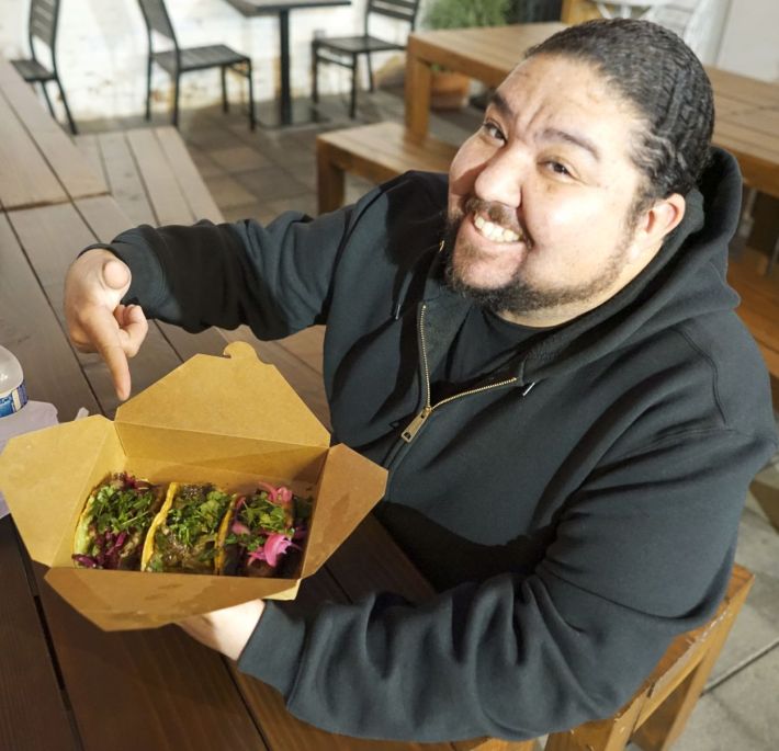 Ramirez explains his specialty tacos like the vegan-friendly Whiskil Taco, made with chayote, chia seeds, and coconut milk. Jose highly recommended the Mixta Taco, and the Mixta Taco comes prepared using specially made longaniza chorizo, filled with mint and jalapeño, and delicious pork butt. Everything at Los Taquero Mucho feels special, even the hand-pressed tortillas using Kernel of Truth tortillas.