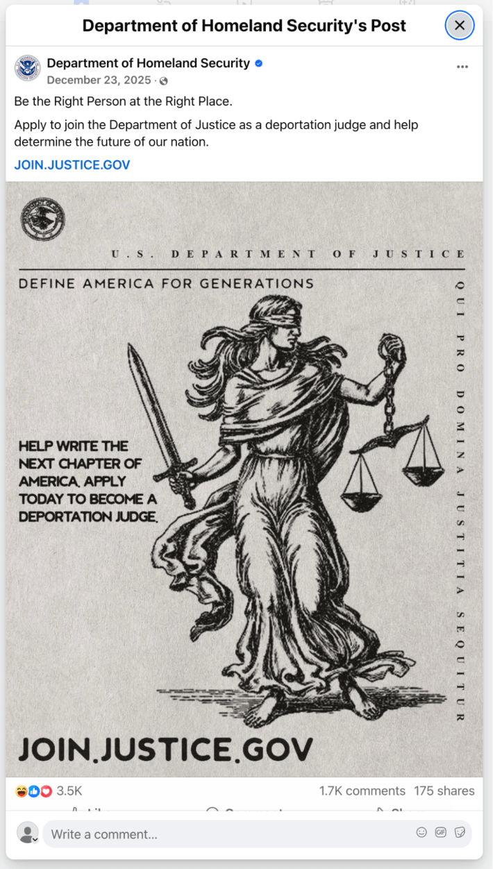 The ads promise what they call "generational consequences" and seek judges who will "remove aliens" and "restore integrity and honor to our Nation's Immigration Court system."
