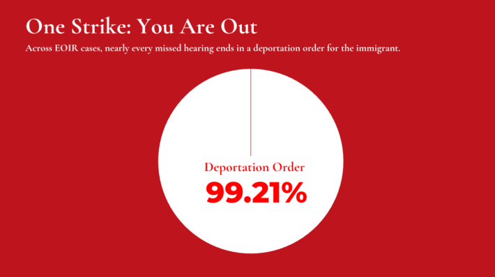 The "abandonment rate" is the percentage of people who never show up to their immigration court hearing—so the judge automatically orders them deported without ever hearing their case.