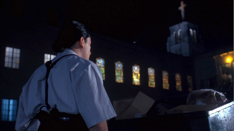 The only identifying markers of this nighttime location shoot are a church’s Spanish-style steeple and its glowing stained glass windows. A Google search of mission church architecture in L.A. eventually led us to an alleyway behind the Westminster Presbyterian Church of Los Angeles in Jefferson Park. The church was built in 1931 as St. Paul’s Presbyterian Church. Westminster acquired the property in 1949 and the building was declared an L.A. Historical Landmark in 1980.