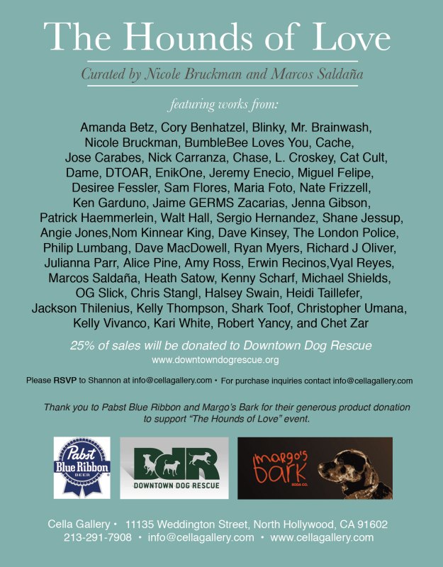 "The Hounds of Love" is a group art show to benefit Downtown Dog Rescue. The show is curated by Nicole Bruckman and Marcos Saldana and includes over 50 artists who have created dog inspired works for the show. covered by "The Hounds of Love" opens September 7th from 6-11pm at Cella Gallery in North Hollywood. For more info, go here: www.cellagallery.com and keep reading to see preview images of some of the work that will be in the show.