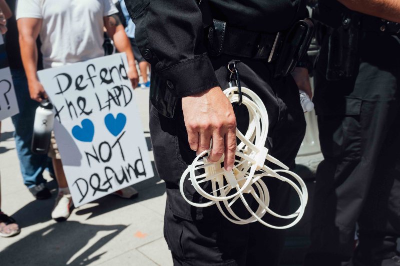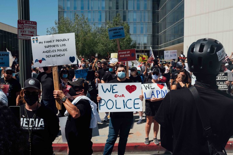 [dropcap size=big]H[/dropcap]undreds of pro-police demonstrators chanting "All Lives Matter" and holding "Defend, Not Defund the Police" signs clashed with dozens of counter-protesters chanting "Black Lives Matter" on Saturday morning. Tensions were high and there were many small altercations between the two groups. Somehow despite the altercations, none of them turned physical.