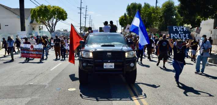 Black community members showed up, expressed their solidarity to Cristobal in front of participants, and provided security and escort for the marchers. Cristobal asked the marchers, for one thing: a peaceful march on Father’s Day. Black community members promised to work hard to keep the peace and provided a group of bikers in the front to escort marchers, a man who asked L.A. Taco to withhold his last name, Eric, provided security on foot.