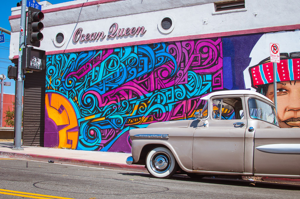 The mural in Boyle Heights at Self Help Graphics is a proactive positive way to bring a visual indigenous aesthetic point of view to a city known for its cultural diversity. Mural art is about becoming part of the community. Murals allow an artist to have a larger conversation within a community. Mural art isn't necessarily about "being seen" as much its really about "seeing" the world around you and speaking on it. Like a skater having fun turning the streets into a moving playground, we wanted to become "one with the environment". As a Native American myself (San Carlos Apache /O'Odham) it was an honor to be invited by friends in Los Angeles, Self Help Graphics (and curate What Tribe) to work in a respected Chicano East Side community with a great tradition of art for the people and "tribes".