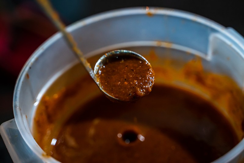 Most of the recipes for the meats and other salsas were passed down by Mariana’s mother. But to make the adobada for the Trompo, Mariana got help from “Al Pastor Taquería Vista Hermosa” in Mercado Paloma, where she also worked a bit. Although the trompo from Mercado Paloma is called al pastor and the original chef is from Michoacán, Mariana, when asked, stated her trompo is a Sonora-style adobada with her own flavors. “Most trompos out there are very simple, just some chiles, salt, and pepper. Ours is a better marinade,” Arturo tells L.A. TACO.