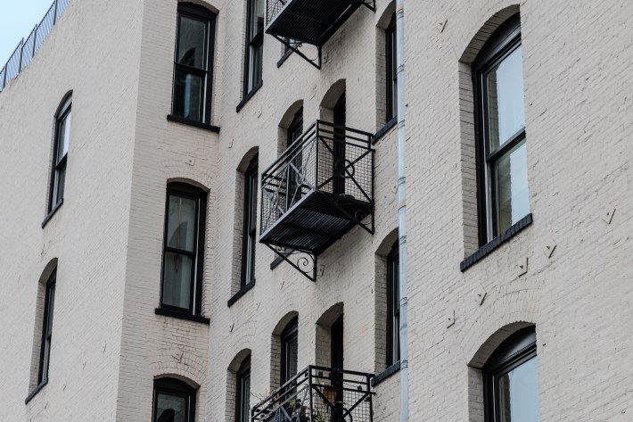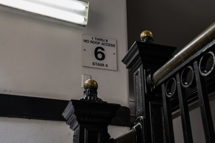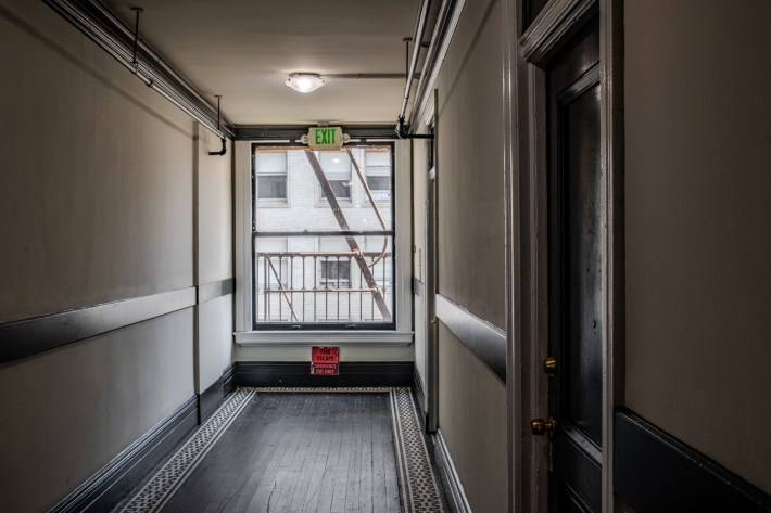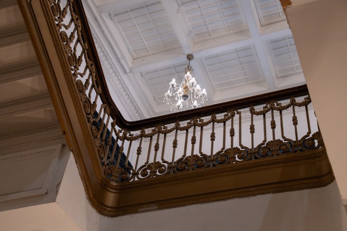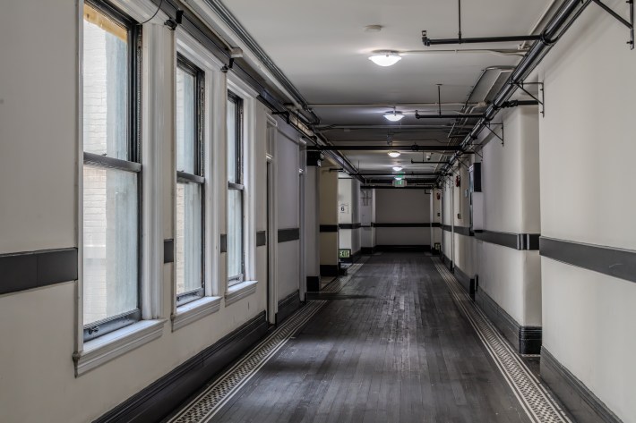 Max also gushes over the building’s skylights, air shifts, ornate black-gloss fire escapes, broken reinforced safety glass, and a lavish plaster-coffered ceiling on the mezzanine level.
