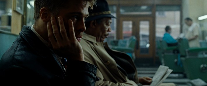 After meeting with the FBI contact at the pizza joint, Somerset and Mills wait for the information from the chairs of a vintage barber shop.