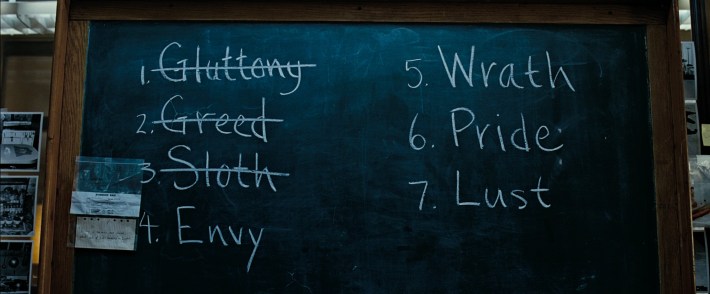 In an effort to assist his new partner, Somerset turns to a familiar place of solitude: a cavernous library where he pulls numerous books dealing with the seven deadly sins.