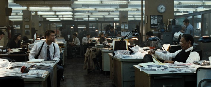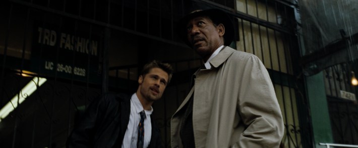 The mild-mannered Detective Somerset (Morgan Freeman), an erudite police veteran who’s on the verge of retirement, and his younger, gung-ho partner, Detective Mills (Brad Pitt), pool together whatever cash they have in their pockets to acquire some backdoor information from the FBI, information that may lead to an elusive and highly methodical serial killer who carefully scrutinizes his victims by way of the seven deadly sins.