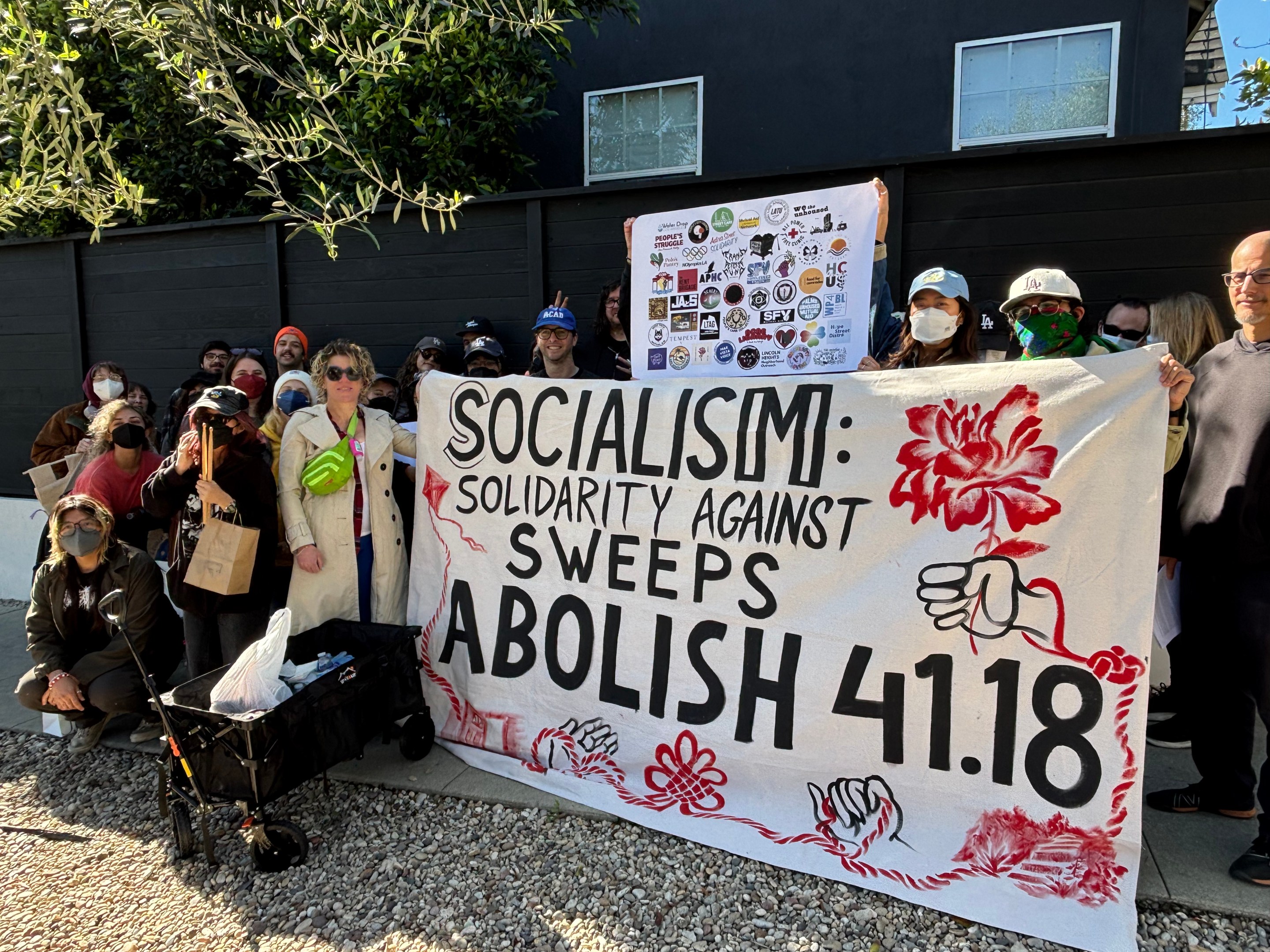 At the protest, the assembled presented a fabric banner reading, “Abolish 41.18,” while passing out baked goods and giving speeches calling for the end 41.18, which can result in fines of up to $2,500 and/or up to six months in jail.