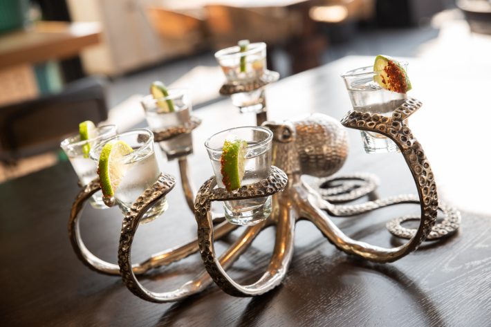 Staring up at the tower from a flat wooden platform below, you’ll find coconut flake, panko, and housemade focaccia-breaded coconut shrimp marinated in an infusion of herbs, coconut milk, and coconut puree; shrimp ceviche “cooked” overnight in citrus juice, with fresh, jalapeño-and-habanero-laced pico de gallo; a generous bowl of guacamole, along with limes and a quintet of salsas including a charred salsa negra, chile lime aioli, guajillo oil, salsa roja, and salsa verde.