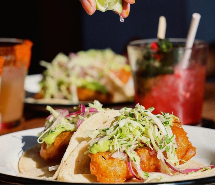 Vamos Vamos pours Yuu Baal as its well mezcal while slipping big, bright orange ingots of battered and fried rock cod into La Princesita’s corn tortillas, topping each with cilantro-lime cabbage slaw, avocado puree, and as much lime juice as your tensile finger strength can yield. And just like that, you’re in your Baja state of mind, Pacific gales grazing your date’s shoulders, the madrecuishe going to your heads.