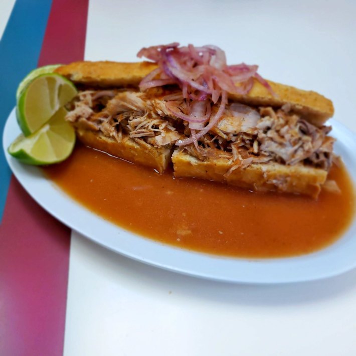 The sign at the location cleverly raises the points of the “A”s to evoke imagery of the neo-gothic church steeples of Guadalajara. This is more of a traditional Mexican restaurant, with the freshly fried corn chips and a mild salsa. The salsa de tomate has a bright orange tinge and a hint of sweetness. The bread has interesting contrasting textures, the bottom of the sandwich starts to break down from the liquid but the top has a nice crunch. The bread is missing the fermented tang that all the components of a torta ahogada brings out. But this torta is a fantastic estimation of an ahogada and those who have never been to GDL won’t notice the difference.