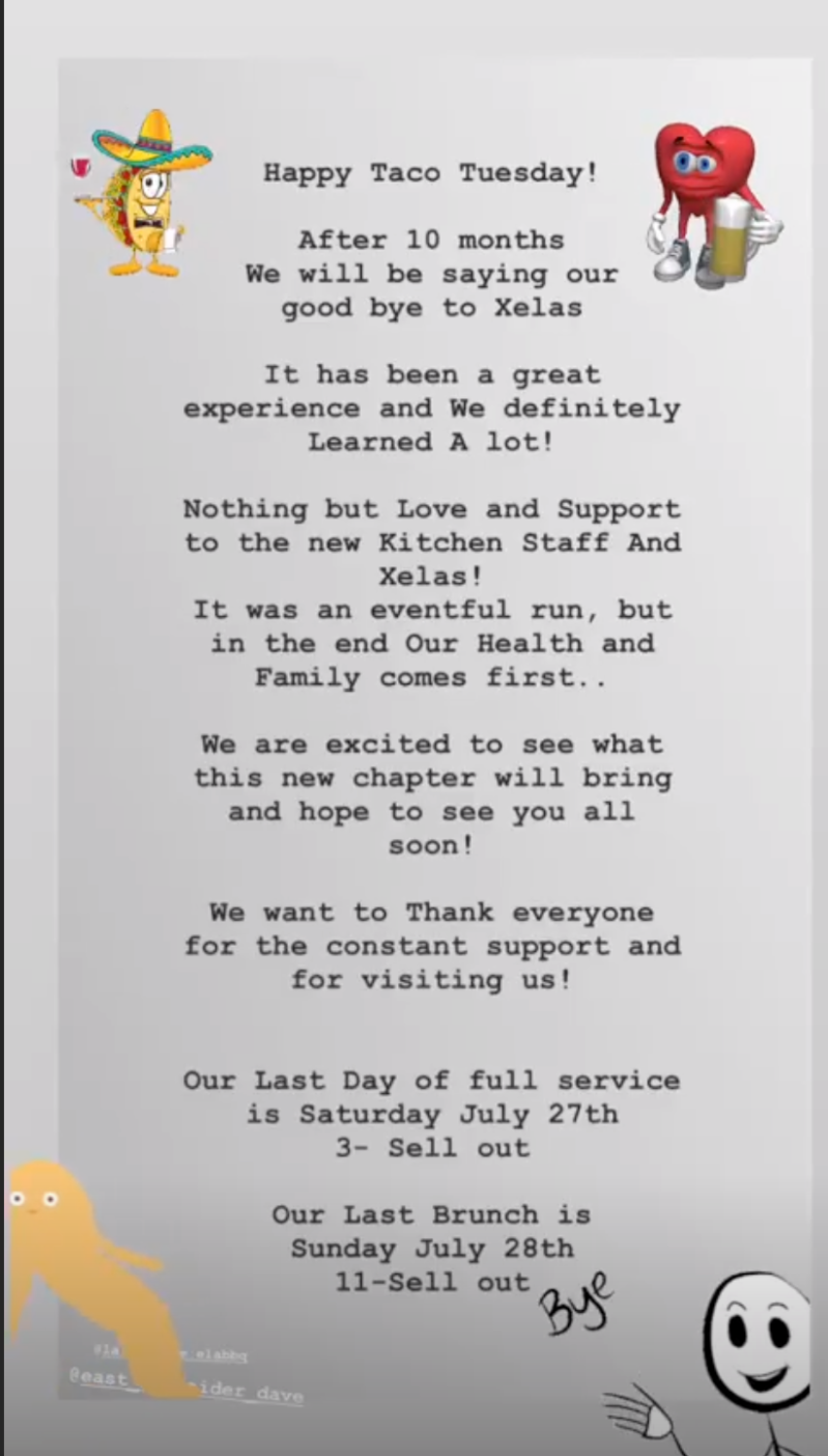 "We are deeply saddened by the residency end of East LA BBQ at Xelas. We are extremely grateful for the opportunity to have worked alongside East LA BBQ; Dave & Carla are great people. Our partnership with them during our first 10 months couldn't have been more amazing. We completely understand the importance of health and family, therefore, we wish them the very best. Our commitment remains the same, to provide the Boyle Heights community with the very best in Cerveza, Comida y Cultura. We recognize that East LA BBQ set very high standards in quality of food and that we will have some big shoes to fill in their absence. They will definitely be missed. We promise the community that we have a big surprise coming to Xelas soon. Stay tuned!" - Xelas