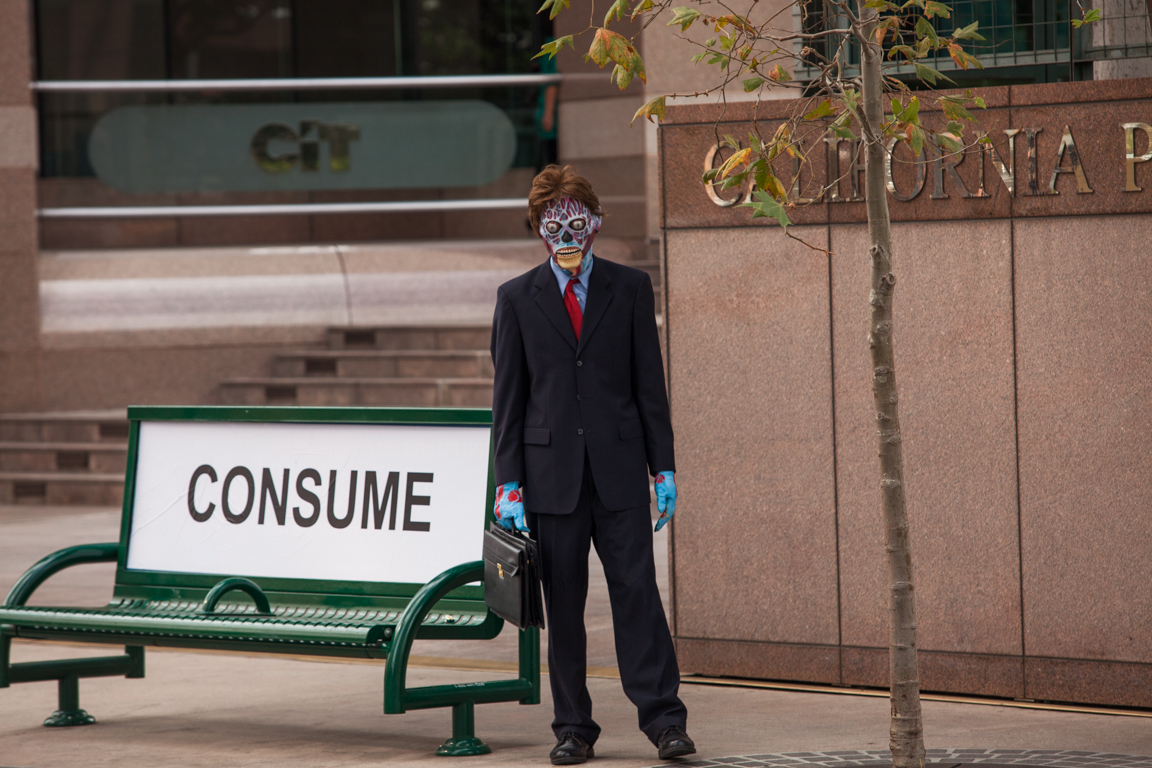Artists Stephen Zeigler and Calder Greenwood gave downtown residents a living installation inspired by the classic film They Live, with signage and an actor dressed as an alien in a business suit as seen through Roddy Piper's magical glasses that reveal the truth of existence. From the film's official description: