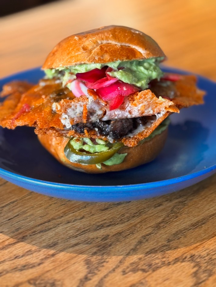 Dishes, which meld Mexican and Lebanese flavors, include cured hamachi with watermelon aguachile; spicy calamari with tamarindo pickle and everything spice; duck confit with duck mole; charred octopus with Rancho Gordo beans and carrot harissa; beef chorizo hueso with hummus mousseline; and mezcal berries, tahini whip, and cafe de olla syrup.